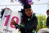 A drag queen in vibrant costume with feathers and sequins holding a sign with the number ten and the word pose, during Pride L.A. View fullsize